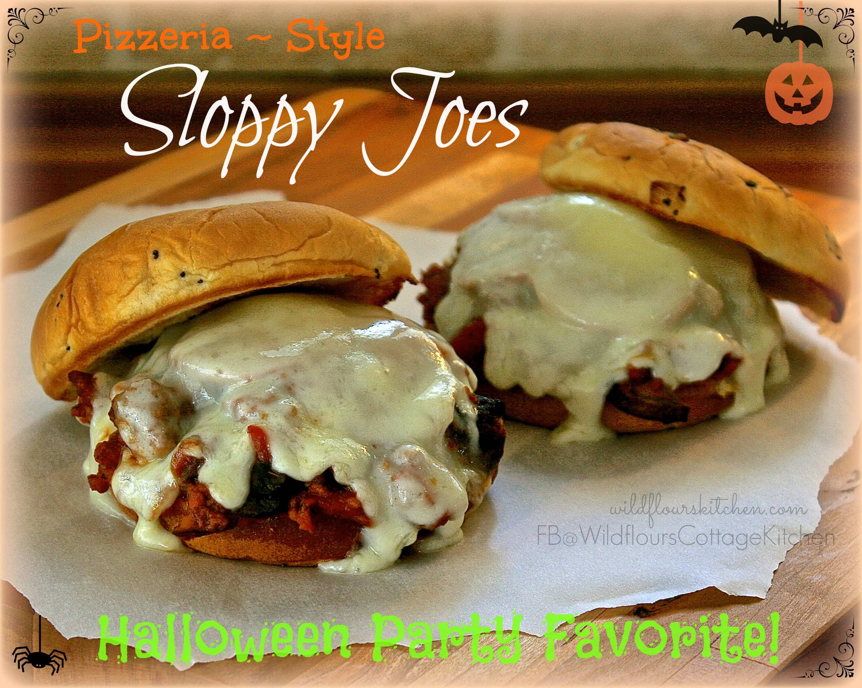 So this was created in my own little humble kitchen, in my pj’s, because I didn’t even feel good to begin with. If I can make a simple sloppy joe taste like a darned good pizza, then shame, shame on all the, (especially commercially owned and operated), faux pizza parodies that claim how great their “high-quality” (*cough* crap) “handmade” pizza is, and how “fresh” their (*cough cough* frozen and dehydrated) ingredients are. I say “bull”. “Buuulllll-oney!” Put the phone down. Toss the mail-ad-menus and misleading coupons aside. Don’t succumb to the scum. Head out to the kitchen with me. 😉 We’ll make something spooktacular with REAL ingredients, really easy, and won’t have us taking a second mortgage out on our homes just to feed our families simply because we have a craving for a pizza, or want to throw a casual Halloween Party as an excuse to be with those we love…with actual food for them to eat…not consisting of “Candy Corn Pie Surprise”. 😉
