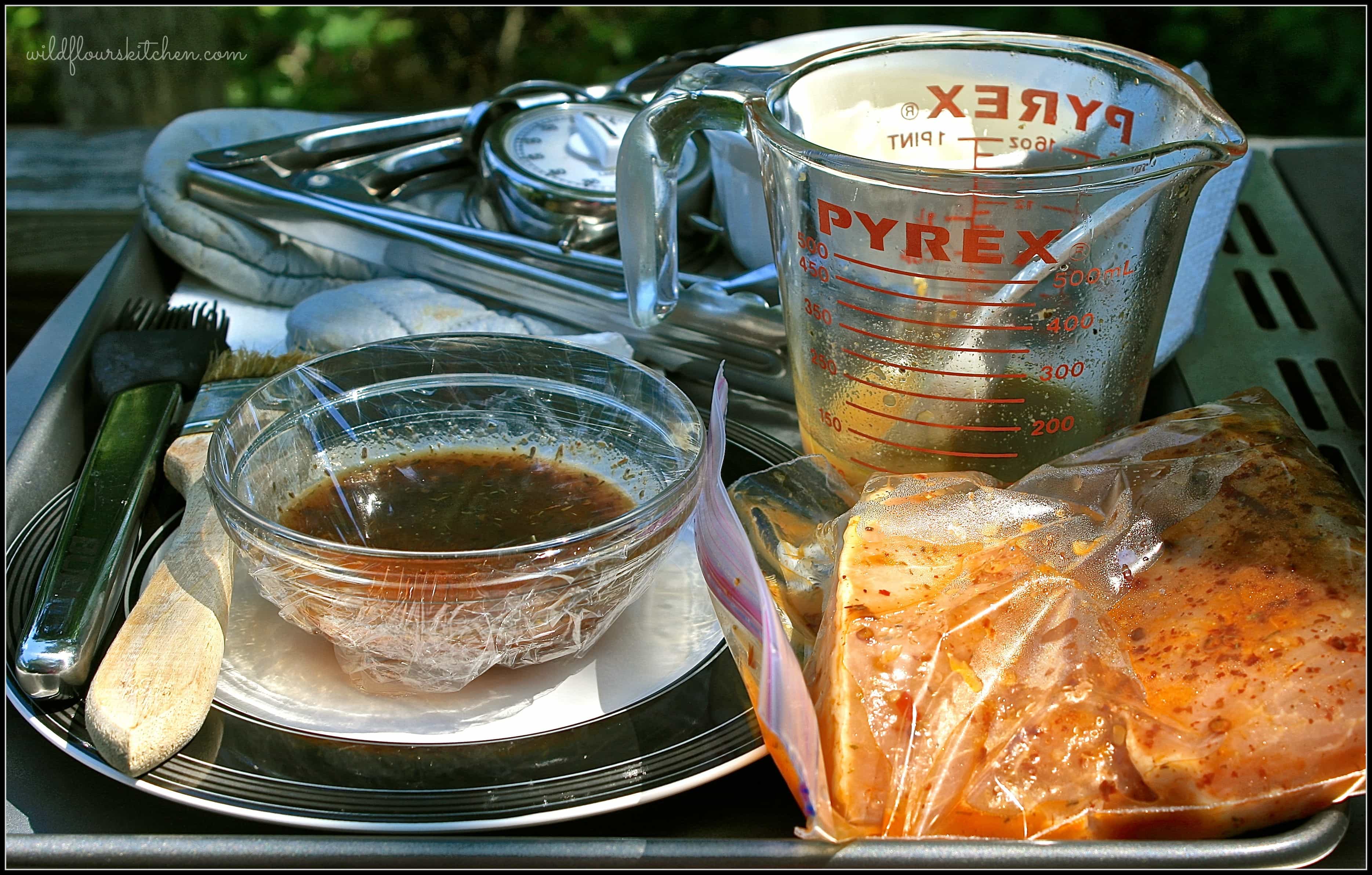 I always make sure I get all of my ducks lined up beforehand, and carry everything out on one large baking sheet. Make sure you have everything you need such as tongs, basting brushes, a dish of vegetable oil with a wadded up paper towel for oiling the grill, a timer, a good safe grill or oven mitt, extra paper towels for hands, a clean plate to put your cooked food onto, and of course, your marinades and food you’re cooking! 😀