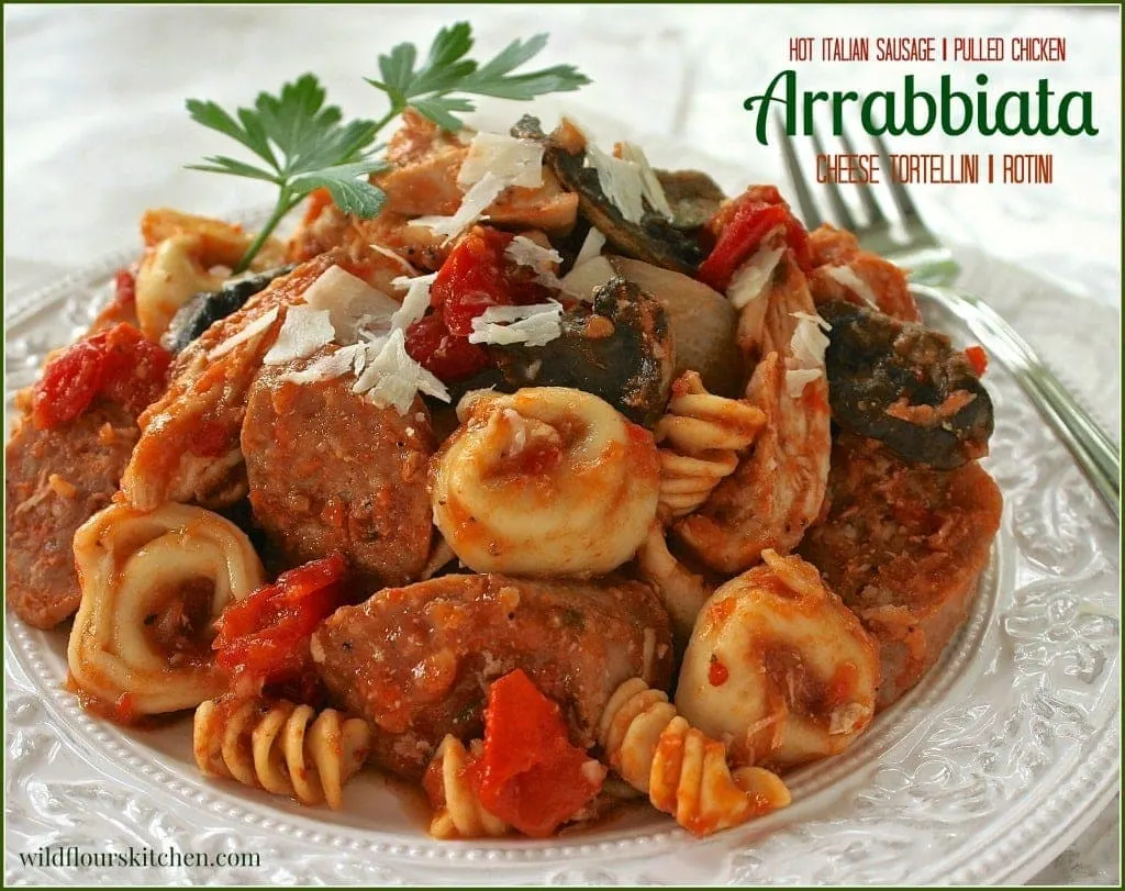 Hot Italian Sausage & Pulled Chicken Arrabbiata with Cheese Tortellini & Rotini (Crock Pot)