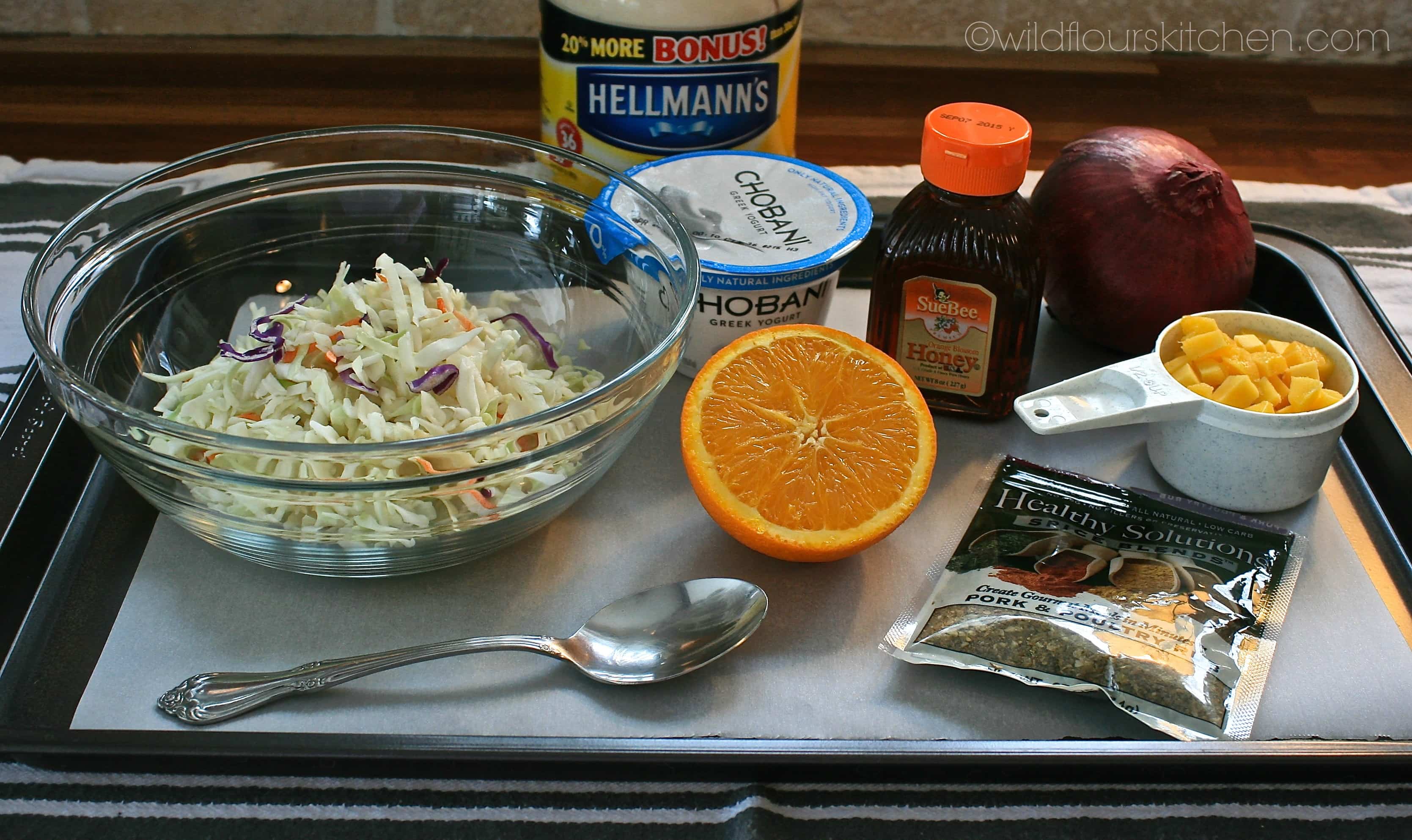 Mild, sweet, broiled salmon, seasoned with Healthy Solutions, fresh juicy pineapple drizzled with pure orange blossom honey, decadent and delicate brie cheese, a naturally sweet slaw with fresh mango, bright orange, mild red onion, and creamy Greek yogurt, all piled onto a tender-soft, delicately sweet, King’s Hawaiian Roll with a little kale! 😉 Sure sounded like a fantastic combination to me! (And the hubby approved, too!) *You could most certainly grill the salmon if you’d like, but my grill currently has 2 feet of snow on it. We just had a huge snowstorm! I’m not that much of a rebel. And a frozen ponytail, snow-crusted slippers, pajama bottoms covered in snow up to my knees, and little icy stalactites hanging from each nostril is not the look I want to go for. 😉