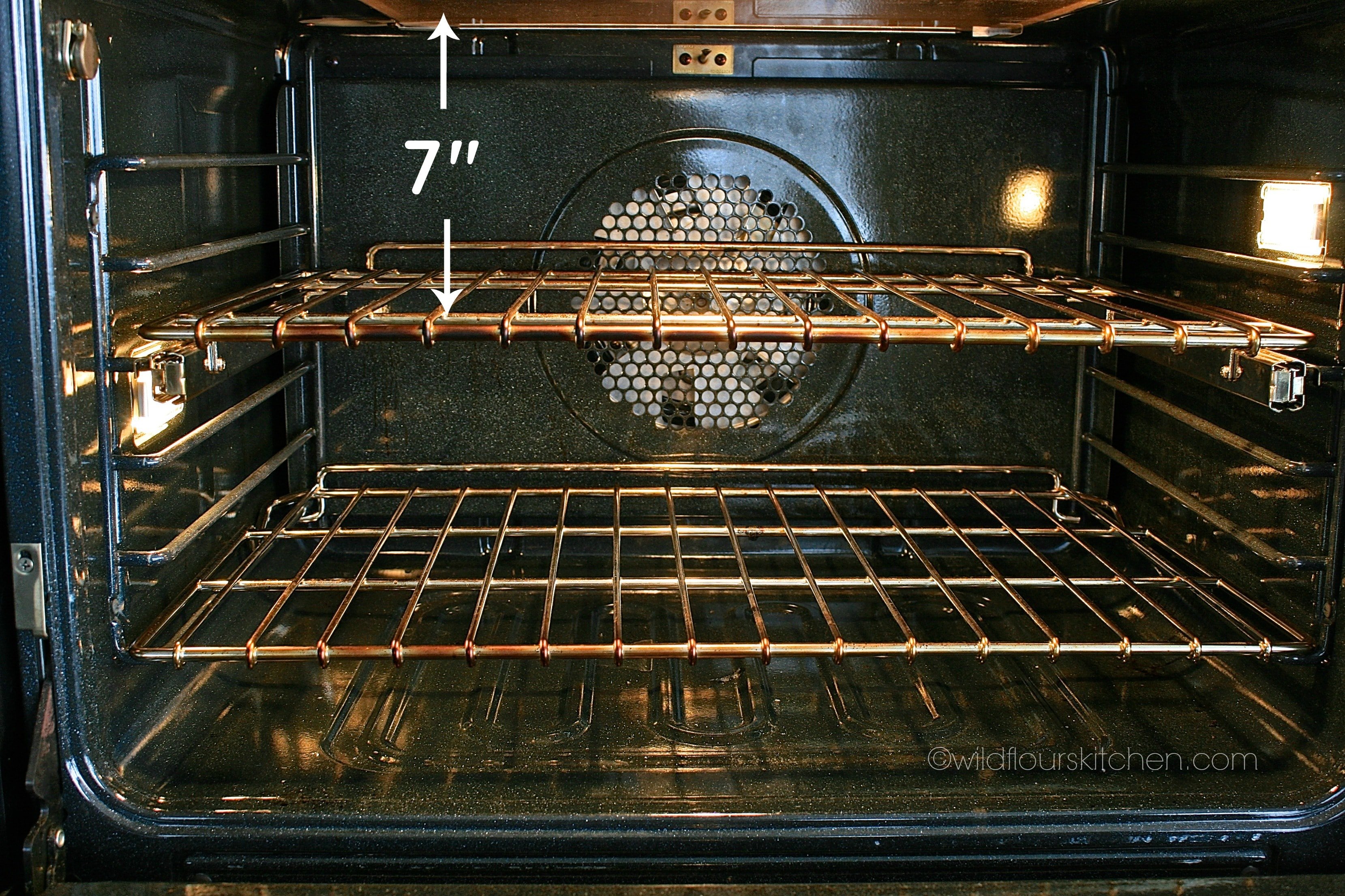 I have double built-in ovens with 6 racks (each). My ovens have a Low, Medium and High broil. So I did it on Medium broil and measured how far away from the broiling element it was for you, to give you an idea so that you can adjust the time and temp according to your own oven. 😉