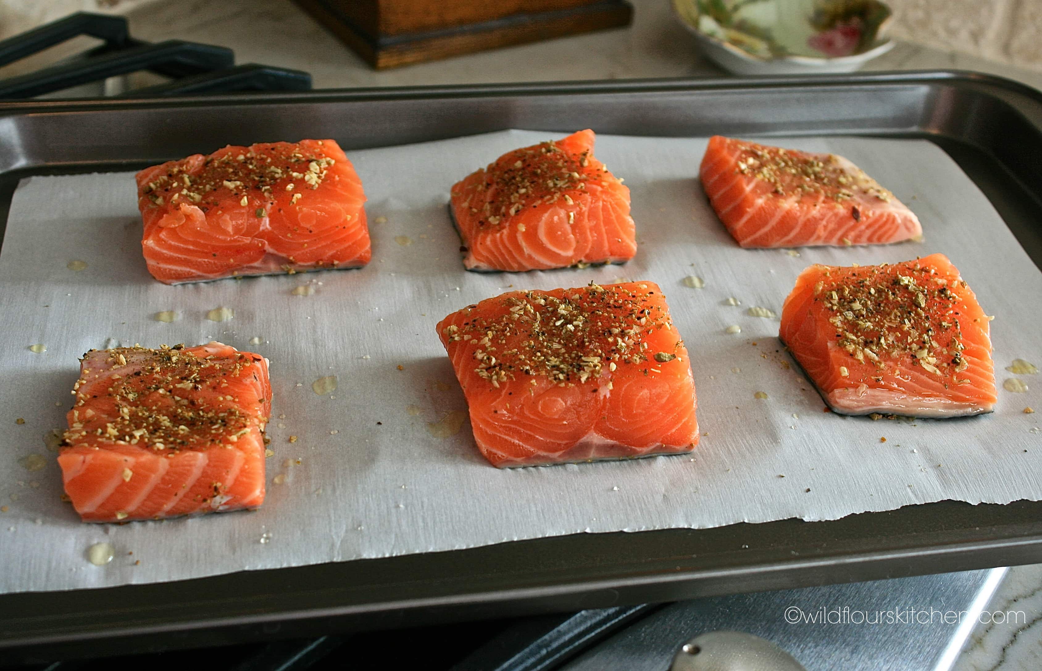 Cut and season the salmon, squeeze fresh orange over them, then place onto a parchment-lined baking sheet. Then do the other side the same way.