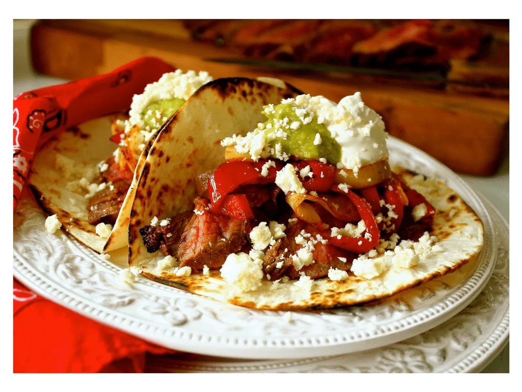 This would be a super fun grill recipe for Father’s Day, summer holidays, block party or get-together, or any summer weekend just for the fam! And one steak goes a LONG way! Which also makes it ideal for serving to company. It also doesn’t require all the extra toppings that typical tacos do. Simple is better for these to let the steak shine and be the star. Marinate the steak overnight, prepare any sides you’d like in advance also, and basically just sear the steak and veggies and you’re good to go! LOW to NO stress for parties!! Set out some cheeses, sour cream, and guacamole. Toss the tortillas onto the grill. And let everybody go to town. DONE.