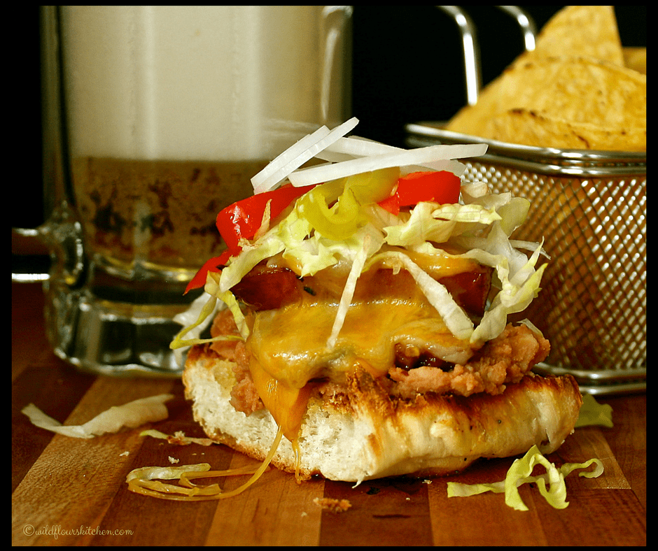 Grilled jalapeño & cheddar sausages smothered with cheese, placed on top of spicy refried beans and a semi-homemade roll, piled with lettuce, tomatoes, onions, and jalapeños! And finished off with a ladle of creamy “salsa sauce”!