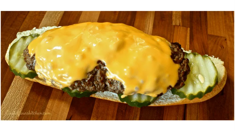 Then season the other side of them well, also. Fry until bottoms are browned, turn and grill other side. When they’re almost done, (peek inside but don’t smash!) top them with American cheese slices torn in half. By the time they melt, your burgers should be done.
