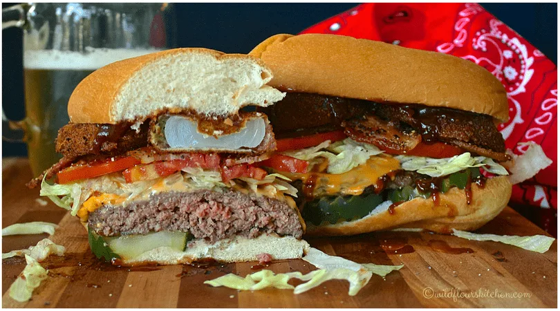 It was no wonder with my homemade Garlic Dill Pickles, a third pound cheese burger, finely shredded lettuce, ruby-red ‘n juicy beefsteak tomatoes from my garden, crisp-cooked peppered bacon, homemade onion rings, and Sweet Baby Ray’s barbecue sauce piled on top of a pillow-soft cushy bun!