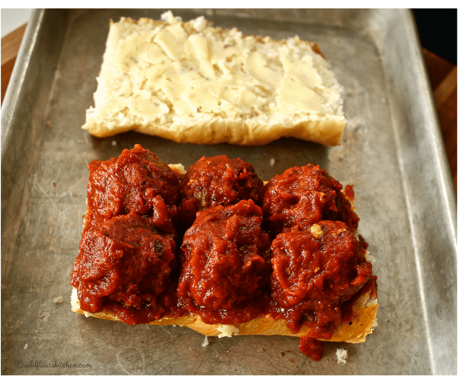 Then just place your baked meatballs into a saucepan with the spaghetti sauce, heat until just a simmer, and place a few onto your garlic and herb butter bread with a little extra of the sauce!