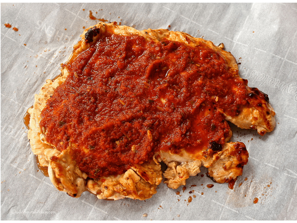 So I decided to make “paillard” chicken pizza, which simply means “pounded thin” and usually grilled, and make that our base for our pizzas!