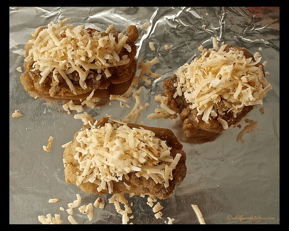 Trim boneless skinless chicken thighs of excess fat, slice in half crossways. Prepare and fry chicken according to my Copycat Chick-fil-A recipe. After resting for a few minutes, place onto foil-lined baking sheet and top with cheese.