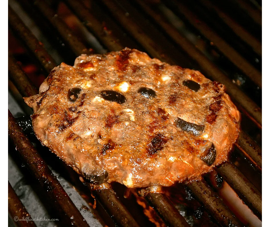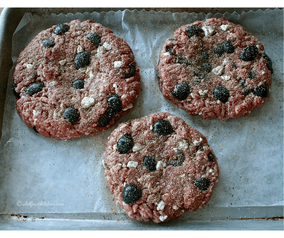 Since sambuca and ouzo, are from Italy and Greece respectfully, I decided, (of course), to go the Mediterranean route, and added feta cheese, ripe olives, and a little oregano right into the burger meat!