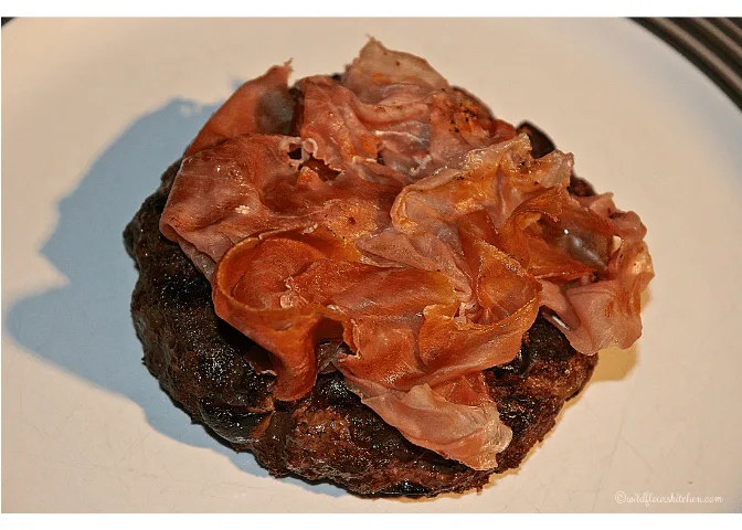 And now it was almost show time! Soooo….here we go! Top the dressed bottom bun with a burger, then a few slices of grilled prosciutto, then some grilled artichoke hearts…