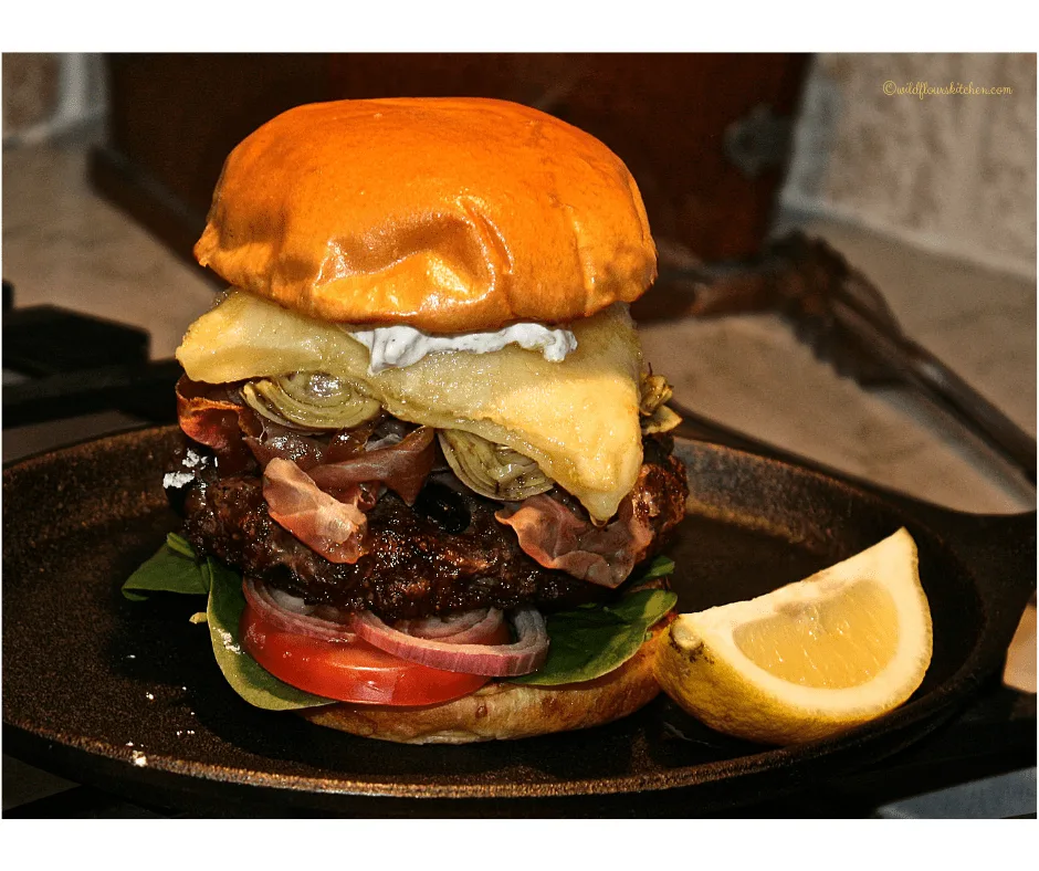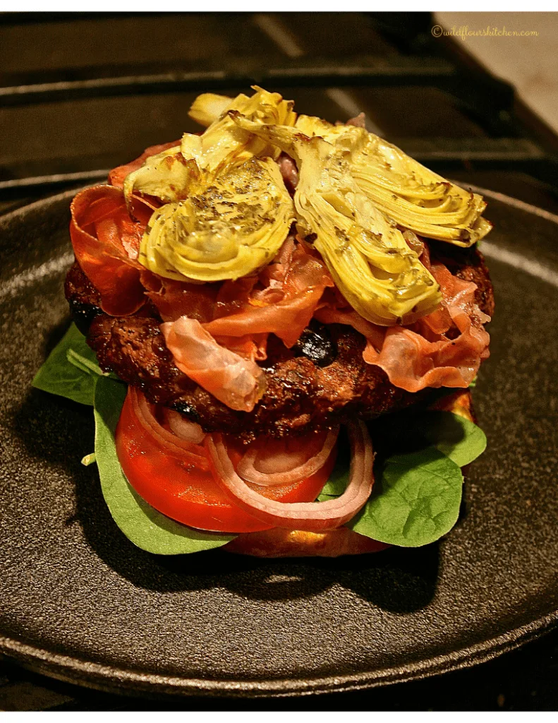 When the burger is done, top it with both the grilled prosciutto and grilled artichoke hearts.