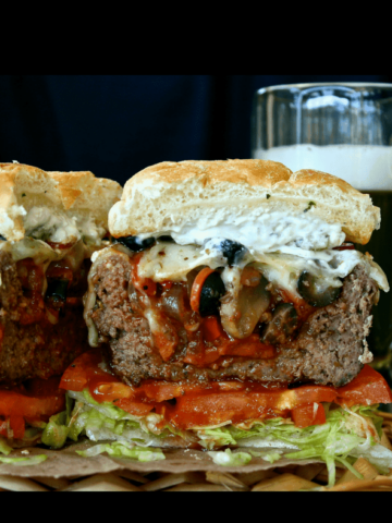 Ok, ya’ll! Spruce up your grills and get ready friends, because my Beer Can Pizza Party Burger Bowls with Blue Cheese Aioli for this year’s #AnnualBurgerMonth event was forking awesome! Let’s put it this way. If a burger and a pizza hooked up, this would be their kindred love child. And it was wicked …